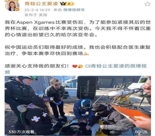 2月4日,谷爱凌在社交媒体上公布自己因受伤无缘亚冬会。图源:谷爱凌微博